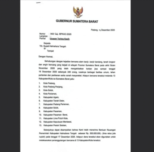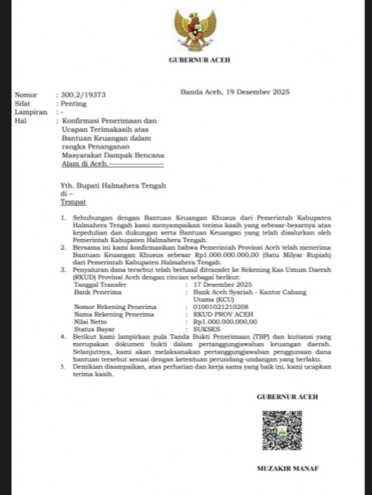 Dalam surat tersebut, Pemerintah Aceh menyampaikan apresiasi atas kepedulian Pemda dan masyarakat Halteng. Bantuan keuangan itu akan difokuskan untuk mendukung upaya pemulihan masyarakat yang terdampak bencana alam di sejumlah wilayah Aceh.