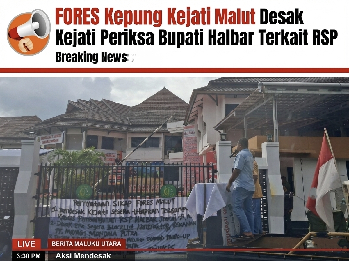 TERNATE, Corongpublik// Forum Strategis Pembangunan Sosial (FORES) Provinsi Maluku Utara menggelar aksi unjuk rasa di depan Kantor Kejaksaan Tinggi (Kejati) Maluku Utara, Jumat (19/12/2025). Aksi tersebut menyoroti dugaan pelanggaran serius dalam pelaksanaan pembangunan infrastruktur dasar di Kabupaten Halmahera Barat di bawah kepemimpinan Bupati James Uang.