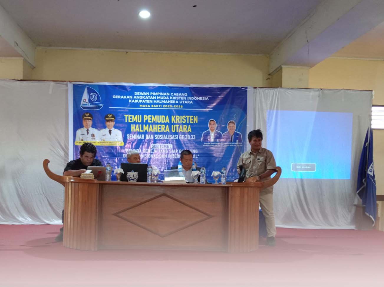 HALUT, Corongpublik// Gerakan Angkatan Muda Kristen Indonesia (GAMKI) Cabang Halmahera Utara menggelar Seminar dan Sosialisasi Program GE 30.33 Pemuda GMIH se-Halmahera Utara yang dirangkaikan dengan Kebaktian Kebangunan Rohani (KKR), Sabtu (27/9/2025) di Tobelo. Kegiatan ini mengangkat tema “Pemuda Gereja yang Siap Bersaing di Aras Nasional dan Internasional”.