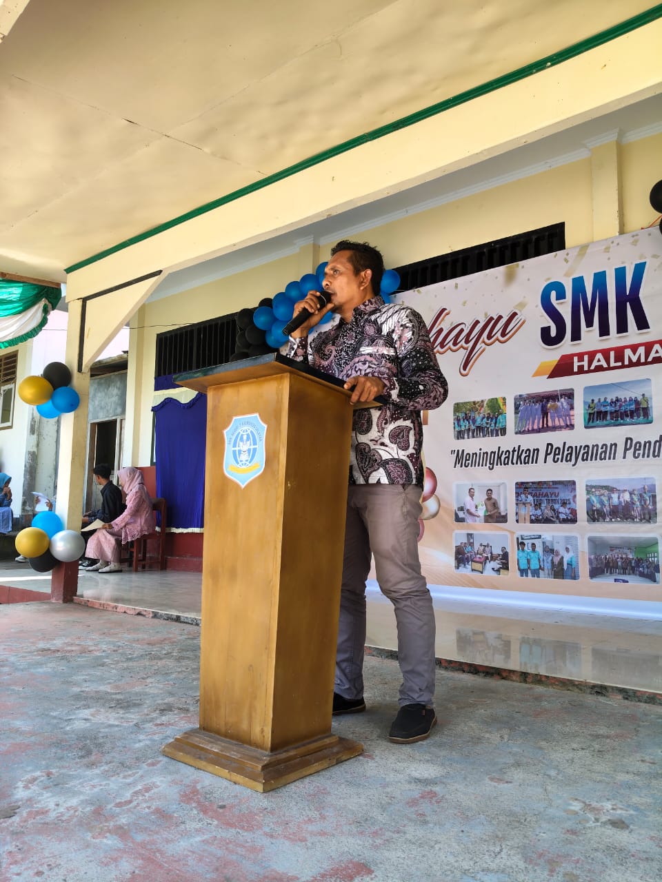 Kepala SMK Negeri 2 Halmahera Selatan yang juga menjabat sebagai Ketua PGRI Kecamatan Pulau Makian, Safrin Hamataher, S.Pd., M.Pd., dalam sambutannya menyampaikan rasa syukur atas perjalanan sekolah yang telah mencapai usia 21 tahun.