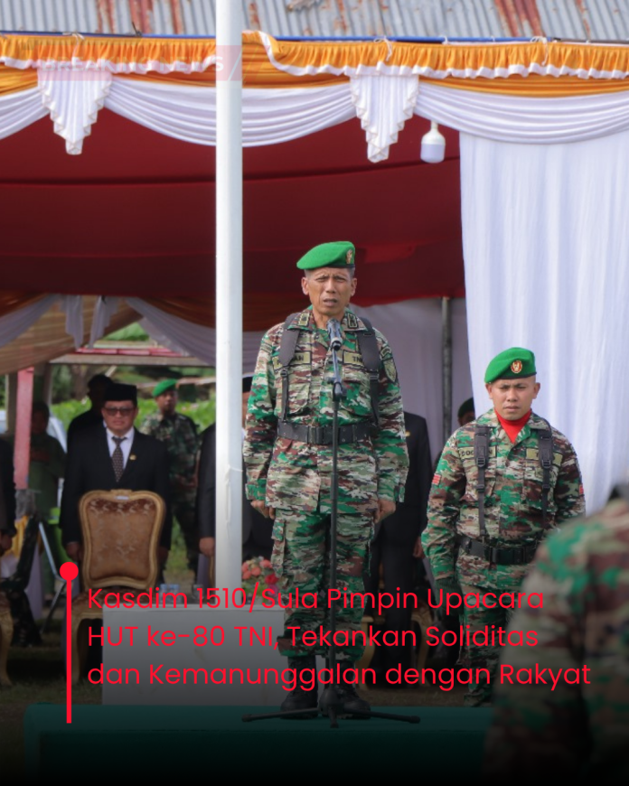 SANANA, Corongpublik// Kepala Staf Distrik Militer (Kasdim) 1510/Sula, Mayor Inf. Pardan, memimpin upacara peringatan Hari Ulang Tahun (HUT) ke-80 Tentara Nasional Indonesia (TNI) yang digelar di Lapangan Sepak Bola Kodim 1510/Sula, Desa Fagudu, Kecamatan Sanana, Kabupaten Kepulauan Sula, pada Minggu (5/10/2025).