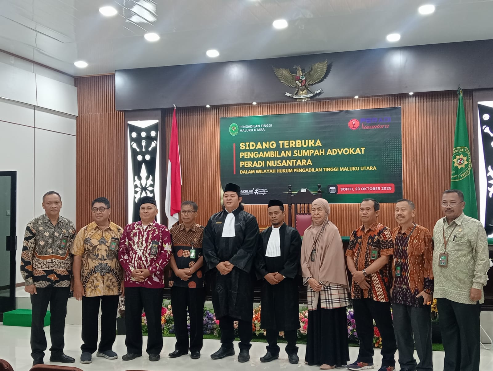 Dalam prosesi tersebut, dua advokat baru resmi mengucapkan sumpah dan janji di hadapan Ketua Pengadilan Tinggi Maluku Utara, yakni Dr. Tommy Sanfaat, S.H., S.Th., M.Th., M.Pd. dan Mahdi Pangadi, S.H.