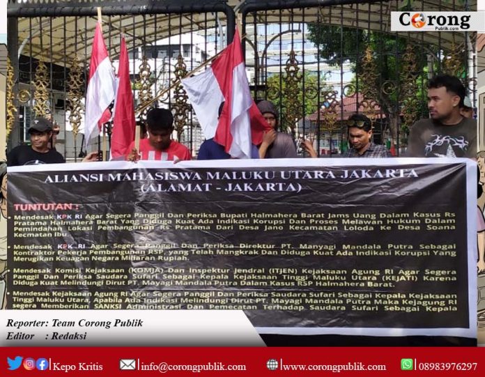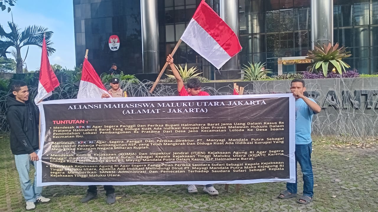 JAKARTA, Corongpublik// Aliansi Mahasiswa Maluku Utara-Jakarta (ALAMAT-Jakarta) kembali menggelar aksi unjuk rasa di depan Komisi Pemberantasan Korupsi (KPK) RI dan Kejaksaan Agung RI, Senin (5/1/2026), menuntut penanganan serius dugaan korupsi proyek Rumah Sakit Pratama (RSP) Kabupaten Halmahera Barat. Massa menilai kasus ini hingga kini belum mendapat respons hukum yang memadai.