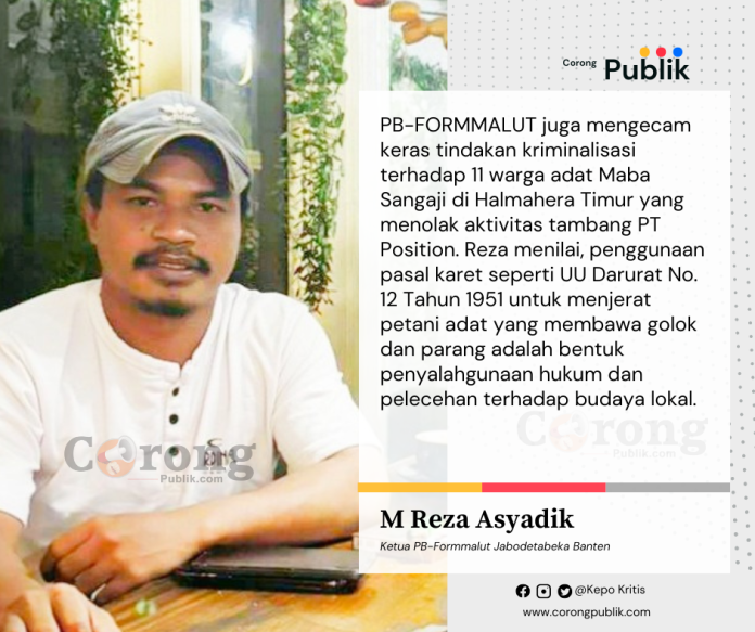 Selain isu tambang ilegal, PB-FORMMALUT juga mengecam keras tindakan kriminalisasi terhadap 11 warga adat Maba Sangaji di Halmahera Timur yang menolak aktivitas tambang PT Position. Reza menilai, penggunaan pasal karet seperti UU Darurat No. 12 Tahun 1951 untuk menjerat petani adat yang membawa golok dan parang adalah bentuk penyalahgunaan hukum dan pelecehan terhadap budaya lokal.