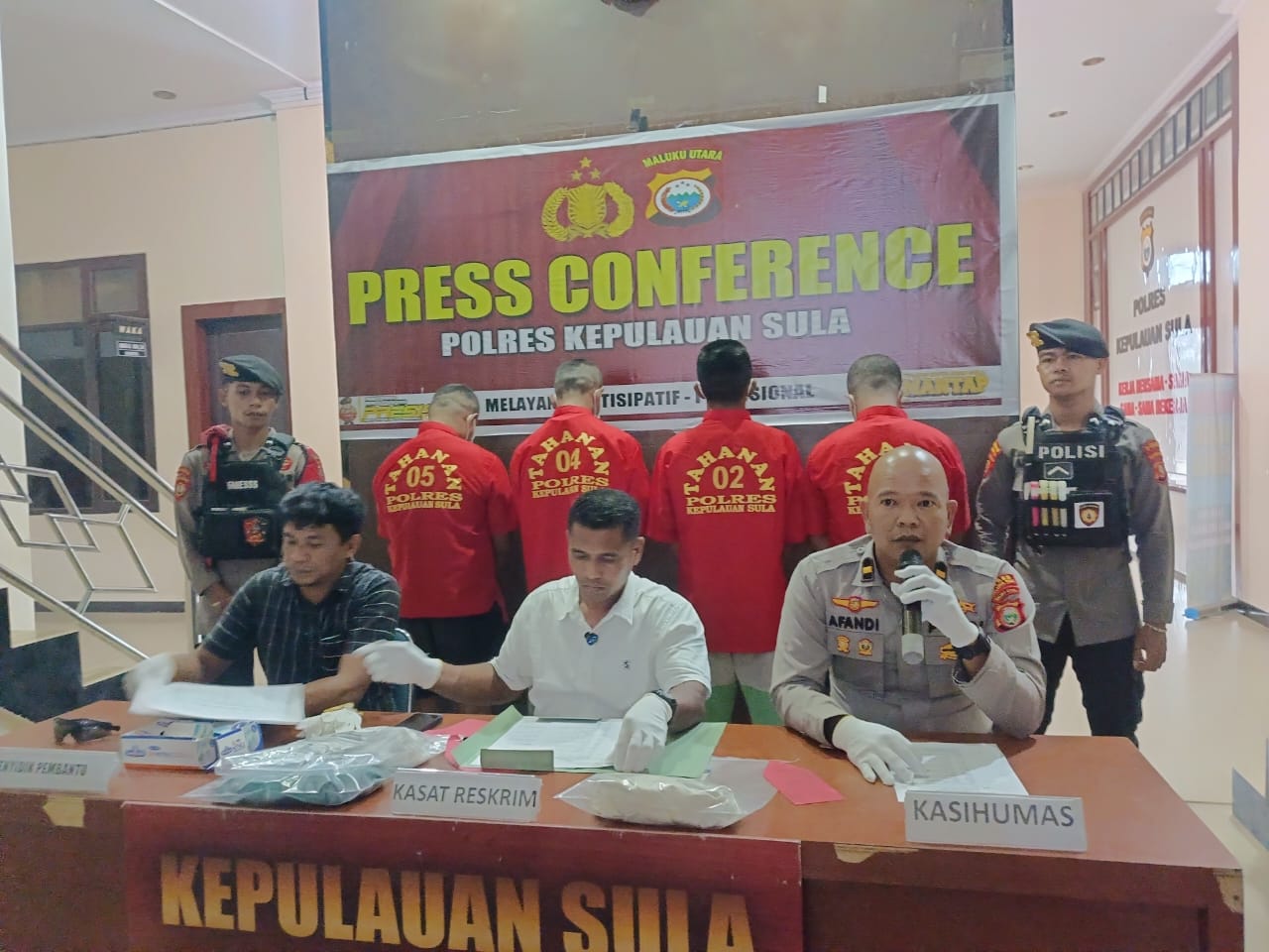 Kasat Reskrim Polres Kepulauan Sula, Iptu Wawan Lauwanto, SH, memimpin rilis perkara tersebut didampingi Kanit Jatanras Aipda Dedi, SH dan Kasie Humas Ipda Jaya Afandi M. Soamena.