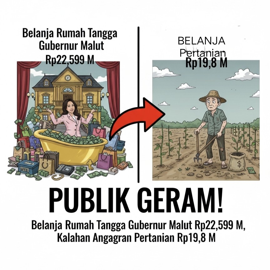 Berdasarkan dokumen RAPBD yang dilansir pikiranummt.com, belanja rumah tangga kepala daerah mencapai Rp22,599 miliar, sedangkan anggaran untuk Dinas Pertanian hanya Rp19,8 miliar. Artinya, kebutuhan pribadi dua pejabat itu lebih besar sekitar Rp2,79 miliar dibandingkan dana yang seharusnya menopang produktivitas 587 ribu petani di Maluku Utara.