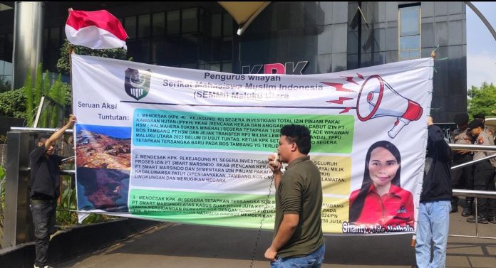 JAKARTA, Corongpublik// Serikat Mahasiswa Muslim Indonesia (SEMMI) Maluku Utara kembali menggelar aksi untuk kedua kalinya, mendesak Presiden Prabowo Subianto menunjukkan komitmen nyata dalam memberantas mafia tambang di Indonesia. Dalam aksi yang digelar di depan Gedung Komisi Pemberantasan Korupsi (KPK) RI, Rabu (15/10/2025), mereka menuntut agar pemerintah segera mencabut izin usaha pertambangan (IUP) PT Smart Marsindo di Pulau Gebe dan PT Halmahera Sukses Mineral (HSM) milik pengusaha Ade Wirawan.